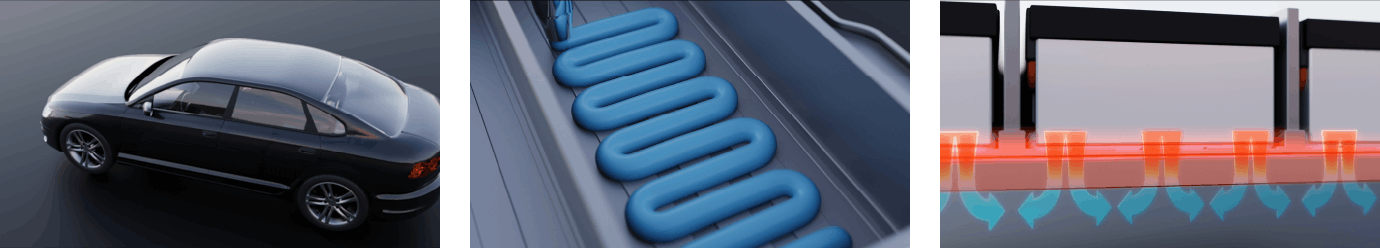 EV自動車やバッテリーパックを透過し内部を表現することで、通常では撮影の難しいバッテリーセルの隙間で接着剤がどのように使用され放熱性能を発揮しているのかを3DCG映像だけで分かりやすく説明しています。