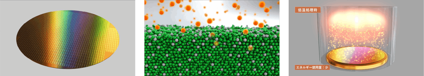 極小単位の化学反応を用いた製品加工技術は人間の目からは確認することができません。しかし、こうした技術の説明も3DCG映像なら分かりやすく表現が可能です。