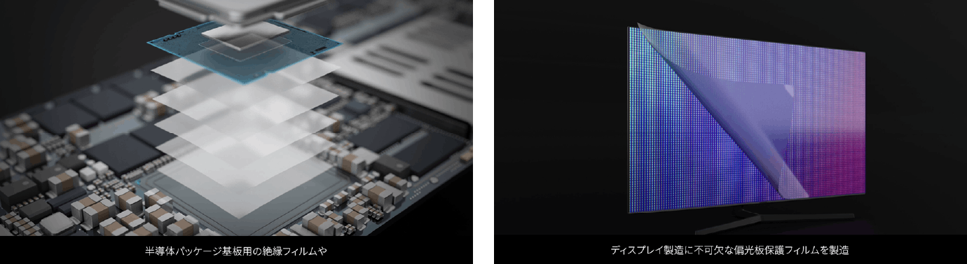 展示会ブースで流すための事業紹介映像を制作。最先端技術が必要な半導体パッケージ基板用絶縁フィルムや世界トップシェアを誇る偏光板保護フィルムなどをつくる、同社の高い技術力と高い生産性を実写映像と3DCG映像を組み合わせることでPRしました。