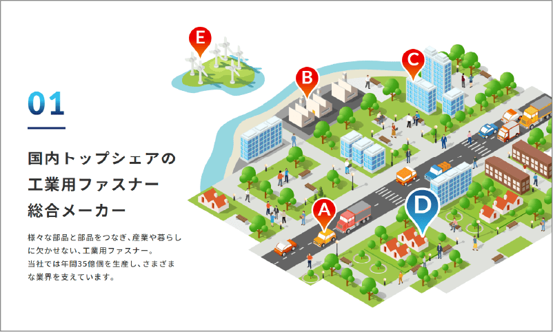 自社製品が活躍する場所が点在するオリジナルマップイラストも制作・掲載で、「製品が社会のどこで活躍しているのか」が一目で分かるようになります。