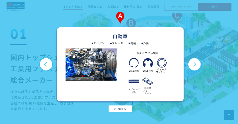 より具体的にイメージできるよう、マップ内のピンをクリックすると活躍場所のイメージ画像と製品イラストを使用した概要説明が表示されます。