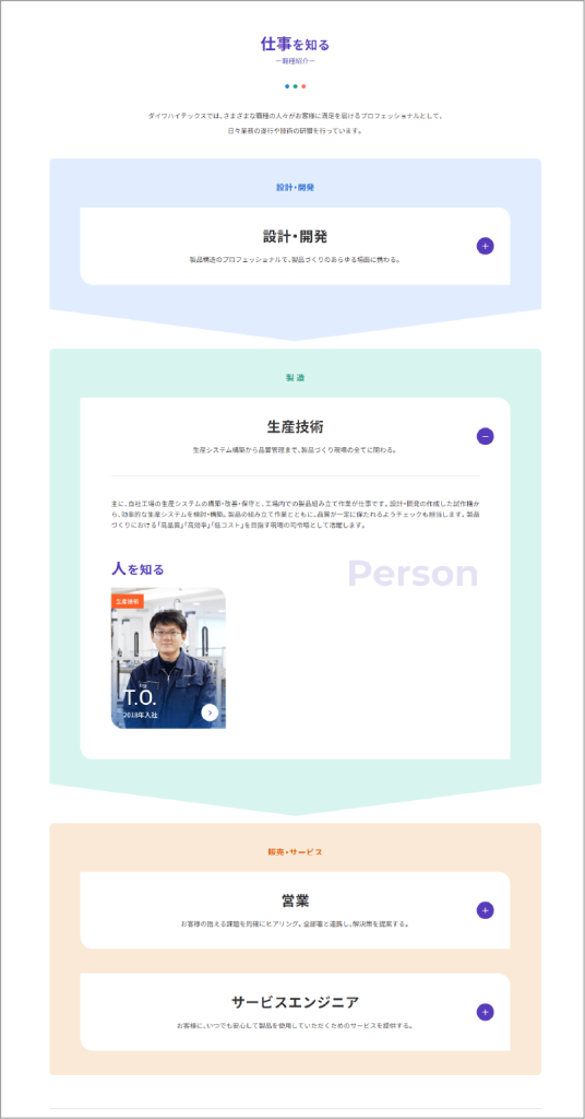 基本的な製造から販売までの流れや、職種の説明、1日の業務などを説明するページを作りましょう。