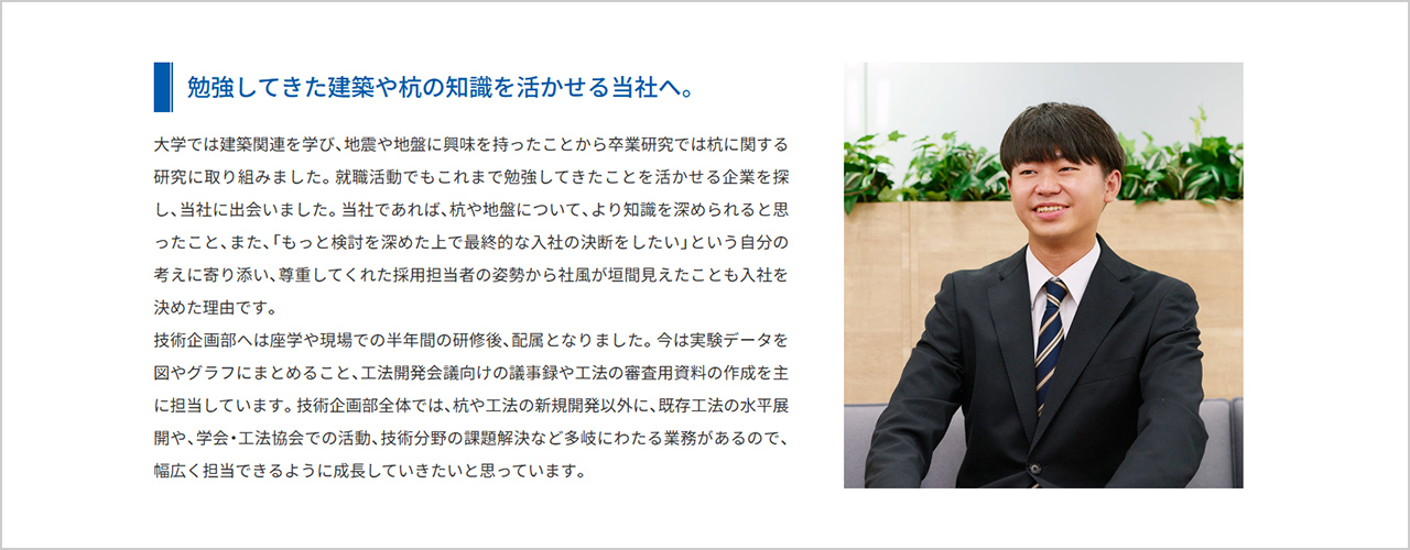 ジャパンパイル株式会社様では、入社後に発見した会社の魅力や、どんな人に入社して欲しいかなど、求職者に向けて一人ひとりメッセージを寄せています。インタビューと仕事風景の真面目な雰囲気から一変、グッと距離が近づき親近感のある印象になります。