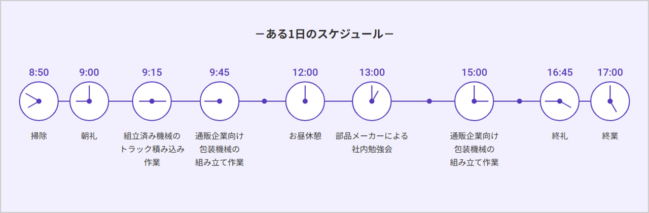 株式会社ダイワハイテックス様では、社員のある1日のスケジュールをタイムライン式で掲載しました。これにより、社内業務が多いのか、それとも客先などに出向いて行う業務が多いのか、仕事の性質を詳細に掴むことができます。さらに、朝礼や終礼、社内勉強会などの活動も紹介することで、社員の日常がリアルに伝わります。