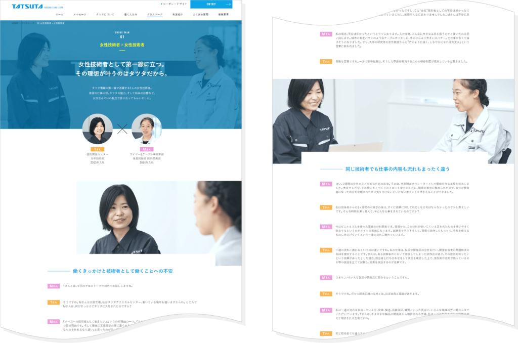 タツタ電線株式会社様では、採用サイトのリニューアルに伴い、「クロストーク」のページを新設。くだけた語調のため関係性や空気感が伝わりやすく、リラックスして読むことができます。一方「働く人たち」のページでは、様々な職種や部署の社員が、仕事のやりがいや今後の目標について熱く語っており、差別化されたコンテンツとなっています。